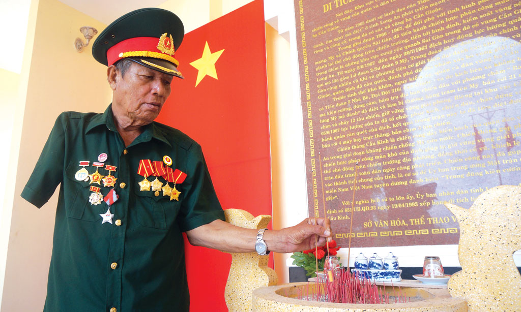Ông Nguyễn Văn Kiểm thắp nhang cho các đồng đội hy sinh tại khu di tích lịch sử cầu Kinh
