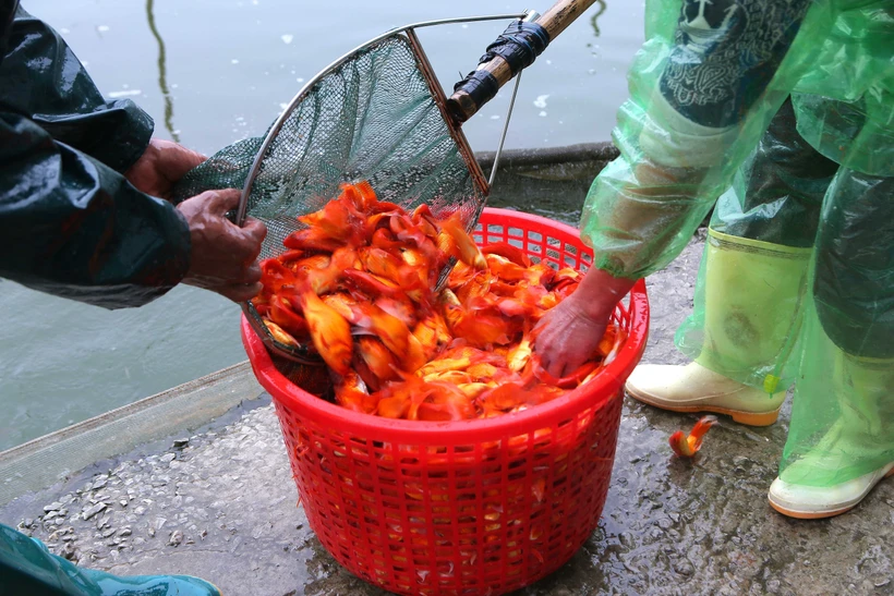 Cá chép đỏ bán được giá, người nuôi cá rất phấn khởi. (Ảnh: Công Luật/TTXVN)
