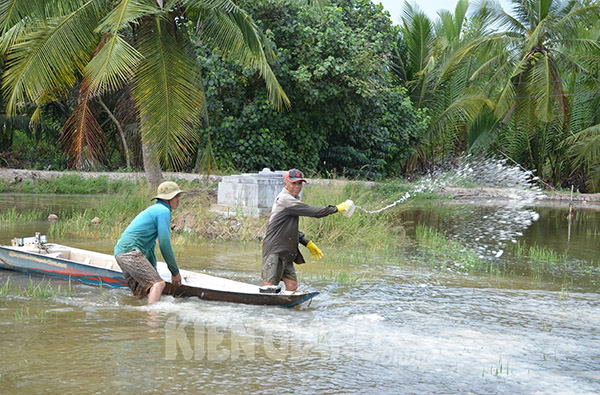 Nông dân ấp Phước An, xã Thủy Liễu, huyện Gò Quao tạt vôi xử lý nước trước khi thả tôm.