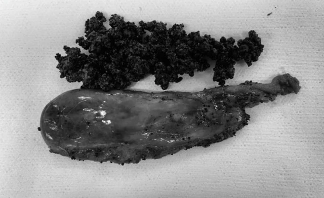 Bệnh nhân H. được điều trị nội khoa ổn định viêm tụy và tắc mật. Bác sĩ Khánh nghi ngờ ống mật chủ có những viên sỏi nhỏ đã thoát vào tá tràng nên viêm tụy và tắc mật giảm. Các bác sĩ quyết định phẫu thuật nội soi cắt túi mật kết hợp với chụp hình đường mật trong mổ. Trong lúc mổ, ê kíp ghi nhận hàng nghìn viên sỏi li ti, kích thước 0,1-0,5 cm trong túi mật của người bệnh.