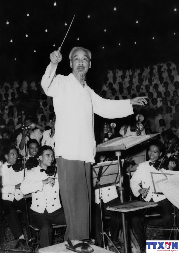 | Bác bắt nhịp bài ca Kết đoàn. (Ảnh: Lâm Hồng Long/TTXVN) |