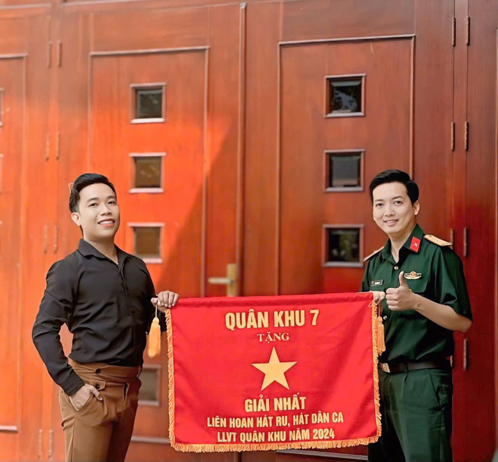 Nguyễn Thành Triều và Trung uý Quân nhân chuyên nghiệp Bùi Thanh Tú cùng Cờ giải Nhất tại Liên hoan hát ru, hát dân ca Lực lượng vũ trang Quân khu năm 2024