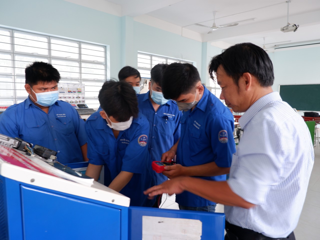 Thầy Trần Minh Đức hướng dẫn học sinh, sinh viên thực hành trên thiết bị đào tạo tự làm