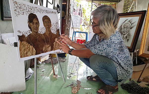 Ông Bảy Nghĩa đang làm bức tranh đôi vợ chồng bằng lá sen.