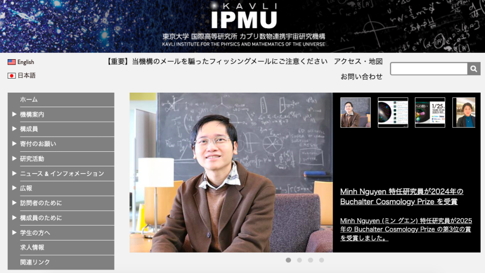 Trang chủ webtsite Viện Kavli IPMU, Nhật Bản đưa tin TS Nguyễn Nhật Minh được nhận giải thưởng Buchalter về vũ trụ học 2024 (ẢNH: QUÝ HIÊN)
