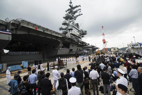 Tàu sân bay USS Ronald Reagan của Mỹ đến căn cứ hải quân Yokosuda (Nhật Bản) hôm 1-10 Ảnh: US NAVY