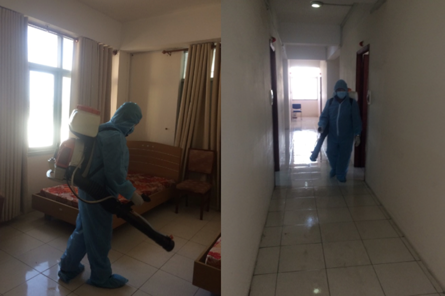 | Trung tâm y tế quận Tân Bình tổ chức phun khử khuẩn tại 2 địa điểm cách ly của Vietnam Airlines. (Ảnh:HCDC). |