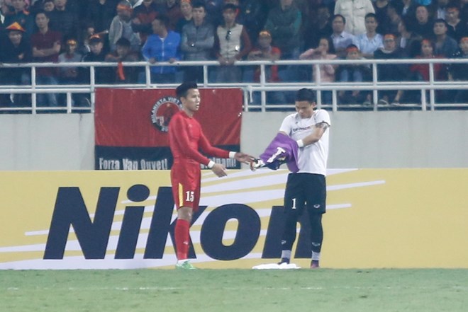 Nguyên Mạnh nhận thẻ đỏ khiến Ngọc Hải phải đóng vai thủ môn bất đắc dĩ. (Ảnh: Minh Chiến/Vietnam+)