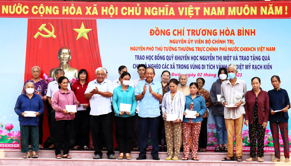 Dịp này, nguyên Phó Thủ tướng Thường trực Chính phủ - Trương Hòa Bình trao 100 phần quà, mỗi phần 1 triệu đồng cho hộ nghèo các xã vùng Di tích Vành đai diệt Mỹ Rạch Kiến, động viên các hộ gia đình vượt qua khó khăn, ổn định cuộc sống./.