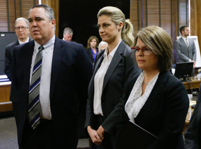 Erin Andrews (giữa) lắng nghe phán quyết của tòa án. Ảnh: Getty Images
