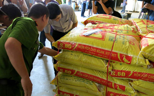 Lực lượng chức năng phát hiện chất cấm salbutamol trong thức ăn chăn nuôi tại Công ty Trường Phú (tỉnh Hải Dương). Ảnh: Người Lao động