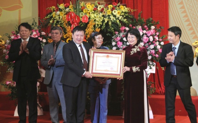 | Phó Chủ tịch nước Đặng Thị Ngọc Thịnh đã trao danh hiệu Anh hùng Lao động thời kỳ đổi mới cho Nhà hát Ca múa nhạc Việt Nam (Ảnh: Bích Ngọc) |