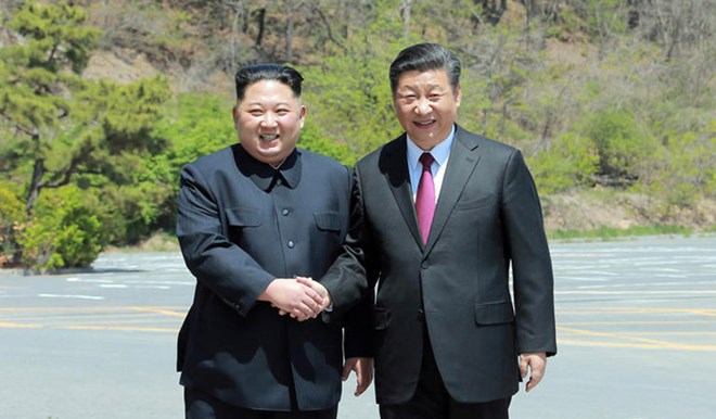 Nhà lãnh đạo Triều Tiên Kim Jong-un gặp Chủ tịch Trung Quốc Tập Cận Bình, tháng 5. (Nguồn: Yonhap)