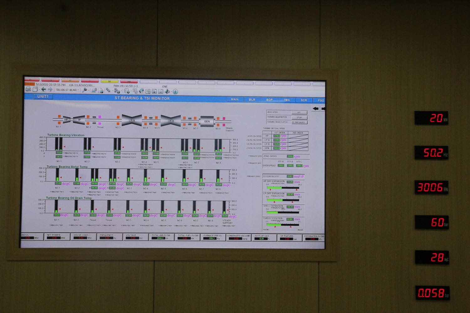 | Bảng điều khiển trung tâm của NMNĐ Thái Bình 2 ghi nhận những kWh đầu tiên từ Nhà máy được phát lên lưới điện. |