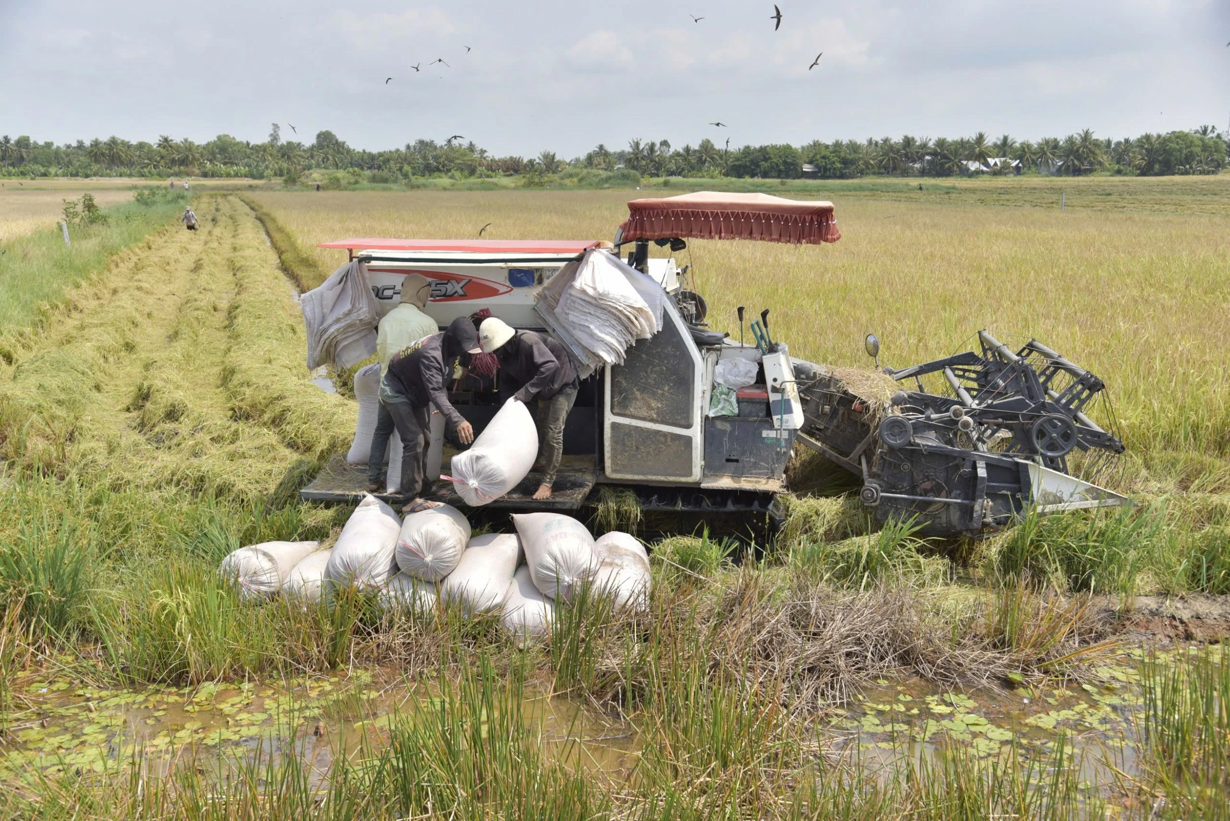 Nông dân xã Mỹ Phước, huyện Hòn Đất (Kiên Giang) thu hoạch lúa đông xuân 2024-2025 thuộc dự án TRVC.