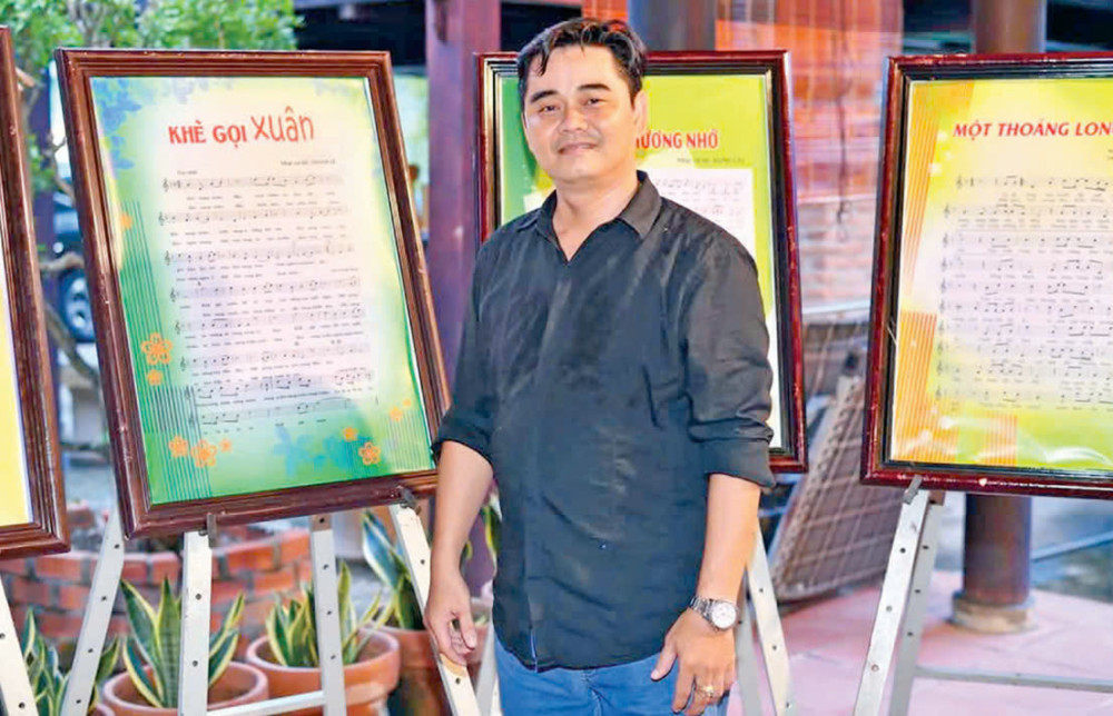 Nhạc sĩ Thanh Lê bên tác phẩm Khẽ gọi xuân được trưng bày triển lãm tại Ngày hội Âm nhạc Việt Nam do Hội Liên hiệp Văn học Nghệ thuật tỉnh tổ chức