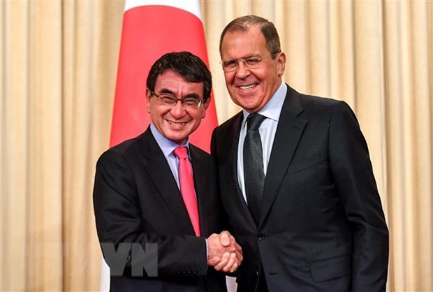 Ngoại trưởng Nga Sergey Lavrov (phải) và người đồng cấp Nhật Bản Taro Kono (trái) tại cuộc hội đàm ở Moskva, Nga. (Ảnh: AFP/TTXVN)