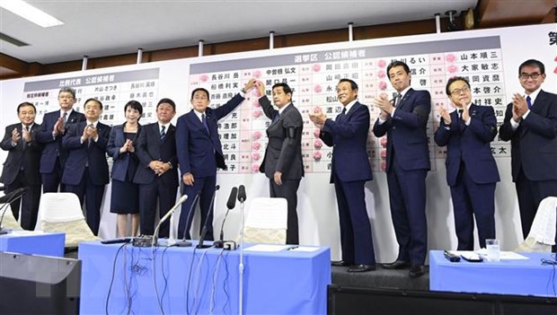 Trong cuộc bầu cử Thượng viện Nhật Bản ngày 10/7, Đảng Dân chủ Tự do (LDP) của Thủ tướng Kishida Fumio giành 63 ghế, tăng 8 ghế so với trước bầu cử. (Ảnh: Kyodo/TTXVN)