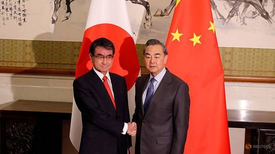 Ngoại trưởng Nhật Bản Taro Kono (trái) và người đồng cấp Trung Quốc Vương Nghị. (Nguồn: Reuters)