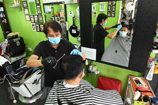 Một hiệu cắt tóc tại Singapore hoạt động trở lại sau khi lệnh hạn chế vì dịch COVID-19 được nới lỏng, ngày 12/5/2020. (Nguồn: AFP/TTXVN)