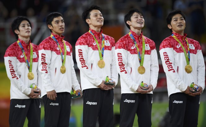 Đội tuyển thể dục dụng cụ nam Nhật Bản tren bục nhận HCV. Ảnh: REUTERS