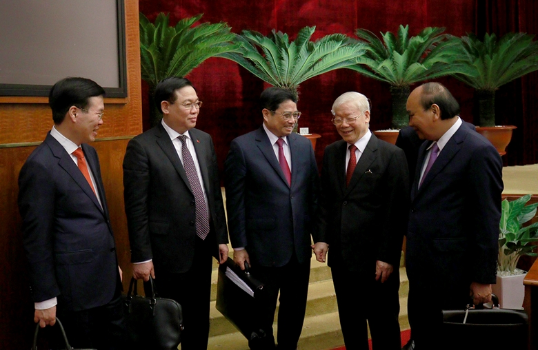 | Tổng Bí thư Nguyễn Phú Trọng, Chủ tịch nước Nguyễn Xuân Phúc, Thủ tướng Phạm Minh Chính, Chủ tịch Quốc hội Vương Đình Huệ và Thường trực Ban Bí thư Võ Văn Thưởng tại phiên bế mạc Hội nghị Trung ương 5 (khóa XIII) - Ảnh: PC |