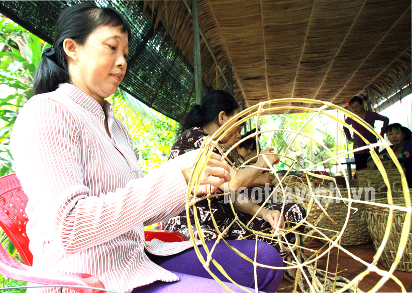 Phụ nữ xã Nhị Long, huyện Càng Long đan sọt lục bình trong thời gian nhàn rỗi, góp phần nâng cao thu nhập cho gia đình. Ảnh: KL