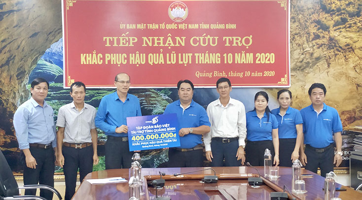 | Đại diện Ủy ban MTTQVN tỉnh Quảng Bình tiếp nhận số tiền 400 triệu đồng từ Tập đoàn Bảo Việt (Ảnh: Diên An) |