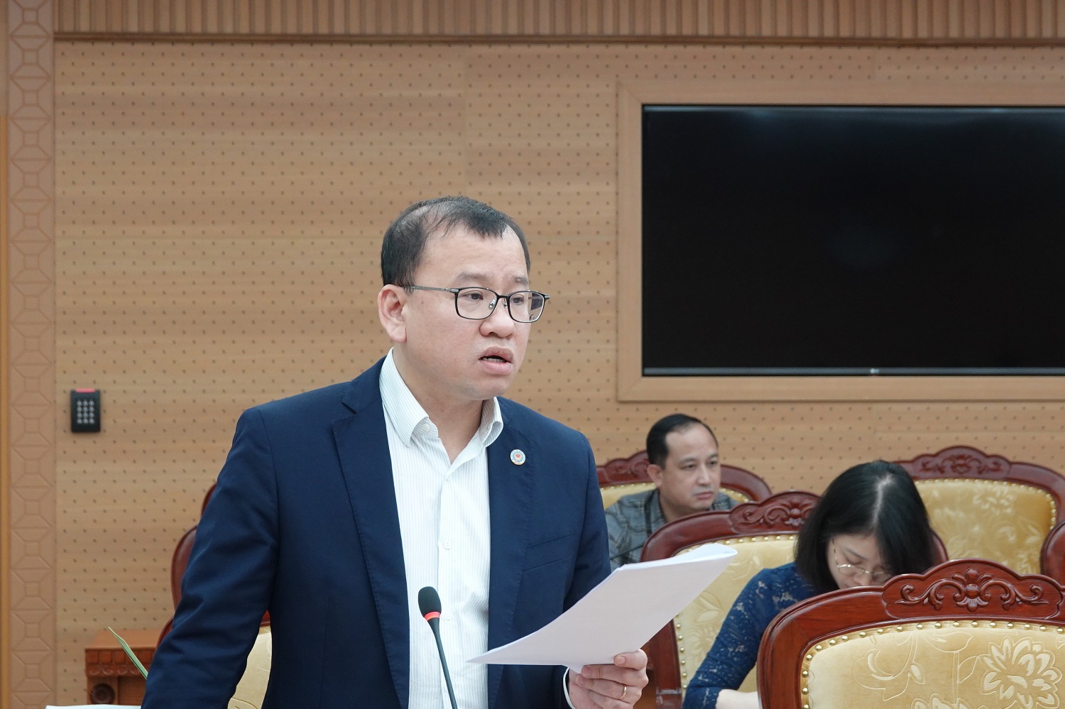 | Ông Nguyễn Hoàng Dương – Phó Vụ trưởng Vụ Tài chính các ngân hàng và tổ chức tài chính (Bộ Tài chính) báo cáo tại cuộc họp (Ảnh: TA) |