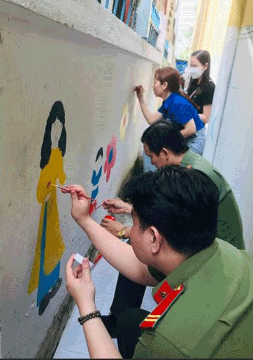 Đoàn phường An Nghiệp, quận Ninh Kiều phối hợp với các chi đoàn của Công an TP Cần Thơ vẽ tranh tường cho Trường Tiểu học An Nghiệp. Ảnh: Đoàn phường cung cấp