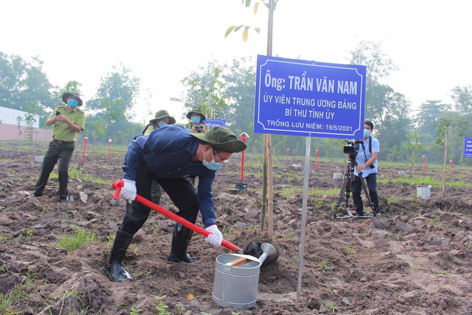 | Bí thư Tỉnh ủy Bình Dương Trần Văn Nam tham gia trồng cây lưu niệm tại Nghĩa trang Liệt sĩ huyện Bàu Bàng. (Ảnh: Thanh Đồng). |