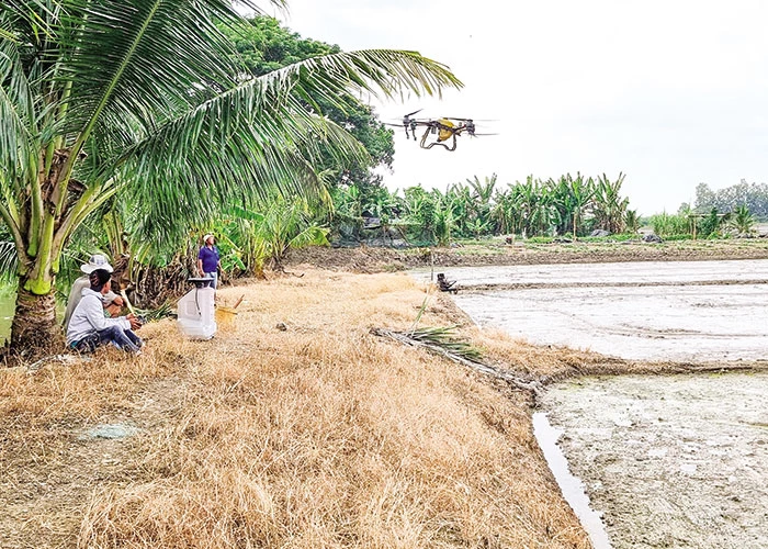 Nông dân ở huyện Thới Lai sử dụng máy bay không người lái để gieo sạ và phun thuốc bảo vệ thực vật cho ruộng lúa.