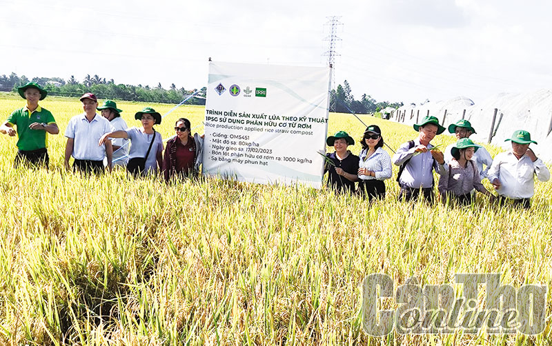 Mô hình trình diễn sản xuất lúa theo kỹ thuật “1 phải, 5 giảm” gắn với sử dụng phân bón hữu cơ từ rơm được thực hiện tại phường Tân Hưng, quận Thốt Nốt trong vụ hè thu 2023.