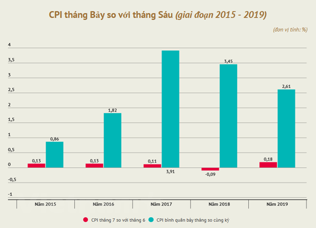 Theo số liệu Tổng cục Thống kê công bố ngày 29/7, chỉ số giá tiêu dùng (CPI) trong tháng Bảy đã tăng 0,18% so với tháng Sáu, tăng 1,59% so với tháng 12/2018 và tăng 2,44% so với cùng kỳ năm trước. Bình quân trong bảy tháng qua, CPI đã tăng 2,61% so với cùng kỳ, song đây vẫn là mức tăng bình quân bảy tháng thấp nhất từ 3 năm trở lại đây.