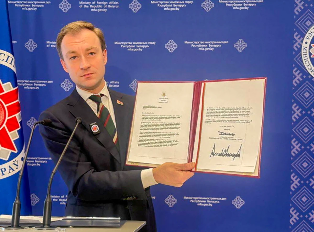 Người phát ngôn Bộ Ngoại giao Belarus Ruslan Varankov cầm thư mời tham gia “Hội đồng Hòa bình Gaza” của ông Trump. Ảnh: Reuters