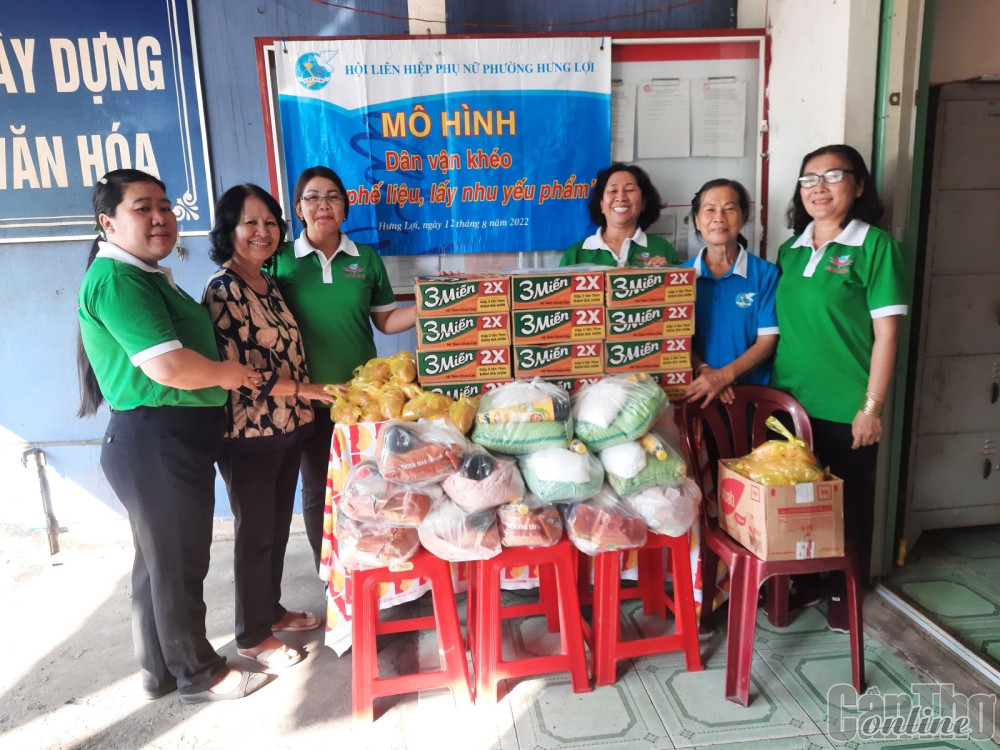 Cán bộ, hội viên phụ nữ phường Hưng Lợi, quận Ninh Kiều, tham gia mô hình “Đổi phế liệu, lấy nhu yếu phẩm”. Ảnh: CTV