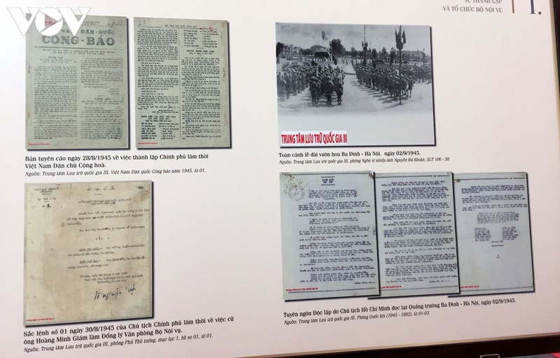 Triển lãm giới thiệu nhiều tài liệu tiêu biểu như: Bản tuyên cáo ngày 28/8/1945 về việc thành lập Chính phủ lâm thời Việt Nam Dân chủ Cộng hòa và cử người đứng đầu, tổ chức các Bộ; Sắc lệnh số 58 ngày 3/5/1946 của Chủ tịch Chính phủ nước Việt Nam Dân chủ Cộng hòa về việc tổ chức Bộ Nội vụ; Lời kêu gọi Thi đua yêu nước của Chủ tịch Hồ Chí Minh năm 1948...