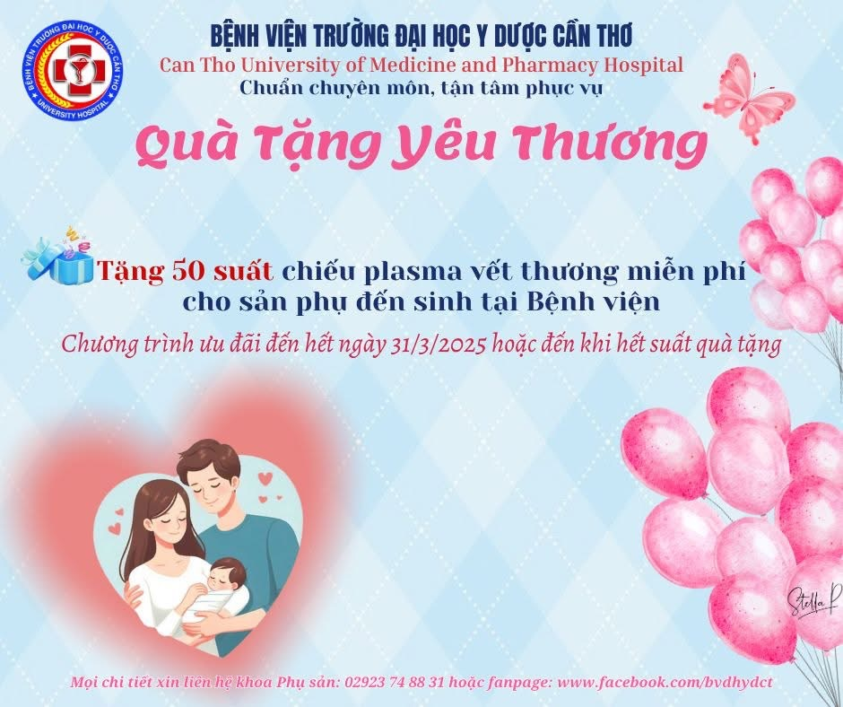 * BV Trường Đại học Y Dược Cần Thơ cũng triển khai chương trình ưu đãi đặc biệt với chủ đề Quà tặng yêu thương đến nhóm bệnh nhân nữ có nhu cầu thăm khám sức khỏe sản phụ khoa tại BV. Theo đó, Khoa Phụ sản tặng 50 suất chiếu plasma vết thương miễn phí cho sản phụ sinh con tại BV. Mỗi sản phụ sẽ được tặng 1 lần chiếu plasma vết thương miễn phí bắt đầu từ ngày 8-3 đến hết ngày 30-3 hoặc đến khi hết 50 suất tặng.