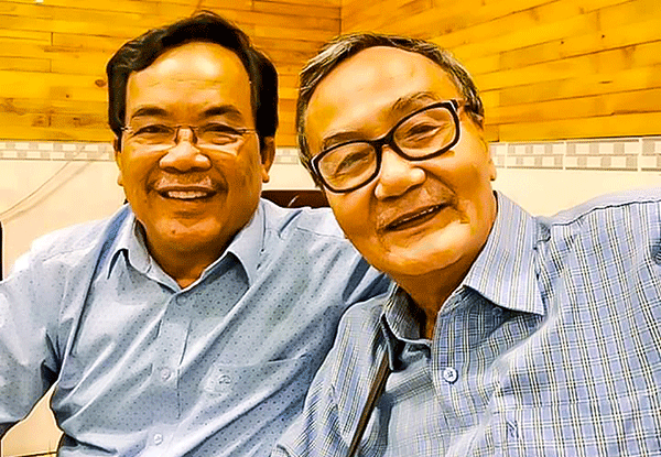 Nghệ sĩ Trần Thiện (bên trái) chụp ảnh cùng NSƯT Hữu Lộc trong lần họp mặt tại Cần Thơ. Ảnh: Nghệ sĩ Trần Thiện cung cấp