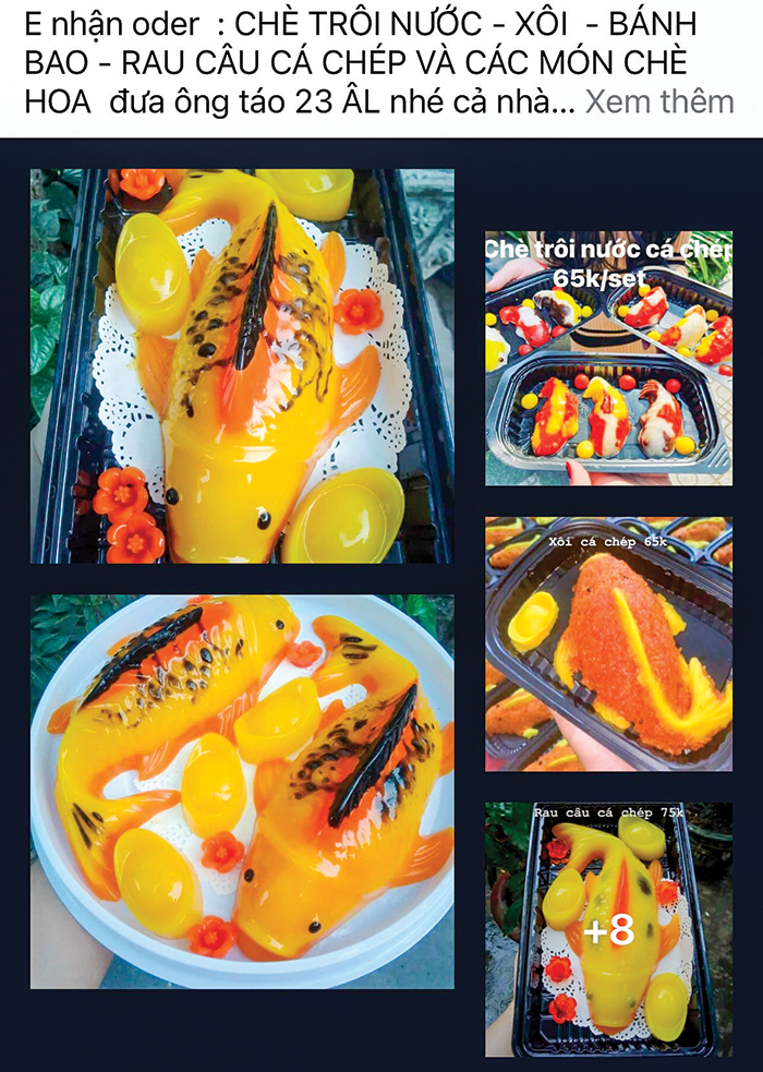 (CT) - Những năm gần đây, các loại cá chép được tạo hình bằng xôi, rau câu hay bánh cho dịp Tết ông Táo (23 tháng Chạp) được ưa chuộng vì thiết thực và đẹp mắt. Để chuẩn bị cho dịp Tết ông Táo năm nay, ngay từ giữa tháng Chạp, các loại cá chép này bắt đầu nhộn nhịp trên mạng xã hội để cho khách hàng tham khảo và đặt sớm. Các sản phẩm đều được làm thủ công, đúc khuôn với nhiều màu sắc đẹp mắt, nên người bán cho đặt trước để chuẩn bị nguồn nguyên liệu phục vụ khách hàng. Người mua có thể tự lấy hoặc chọn giao hàng vào ngày 22-23 tháng Chạp.