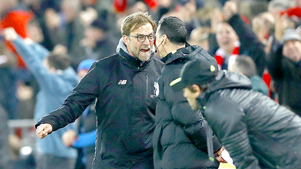 HLV Liverpool Jurgen Klopp (trái) nổi nóng với trọng tài. Ảnh: Metro