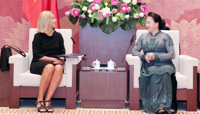 Tại buổi tiếp, Chủ tịch Quốc hội Nguyễn Thị Kim Ngân chào mừng Phó Chủ tịch Ủy ban châu Âu Federica Mogherini thăm và làm việc tại Việt Nam. Chủ tịch Quốc hội Nguyễn Thị Kim Ngân hoan nghênh những bước tiến mới trong quan hệ Việt Nam – EU khi hai bên vừa ký Hiệp định Thương mại tự do (EVFTA) và Hiệp định Bảo hộ đầu tư (EVIPA). Hai bên cũng triển khai các cơ chế hợp tác như Ủy ban hỗn hợp nhằm triển khai Hiệp định Đối tác Hợp tác Toàn diện Việt Nam – EU (PCA); phê chuẩn và đưa vào triển khai ngay sau khi có hiệu lực Hiệp định Đối tác tự nguyện về thực thi Luật Lâm nghiệp, quản trị rừng và thương mại lâm sản (VPA/FLEGT).