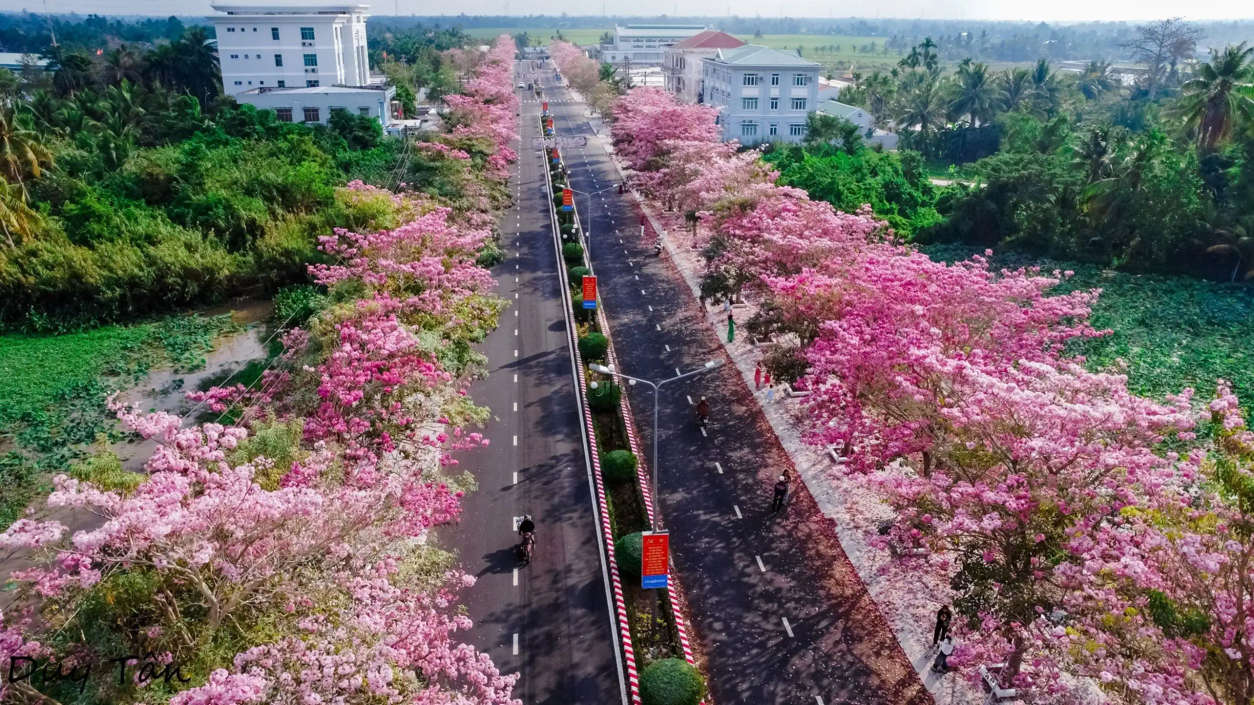 Con đường hoa kèn hồng này được trồng trên đường Hùng Vương, nối từ quốc lộ 1A đến khu hành chính huyện Châu Thành, với khoảng 160 gốc kèn hồng được trồng, đều đặn nở hoa đúng độ. Những gốc hoa hồng tươi hai bên đường, những cánh hoa lả chả bay trong gió, làm nên hình ảnh đáng nhớ.