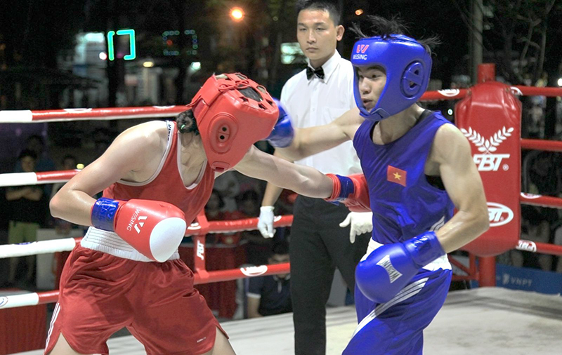 Nữ võ sĩ Đỗ Hồng Ngọc (phải) tại giải boxing các CLB toàn quốc 2017. Ảnh: NGUYỄN MINH