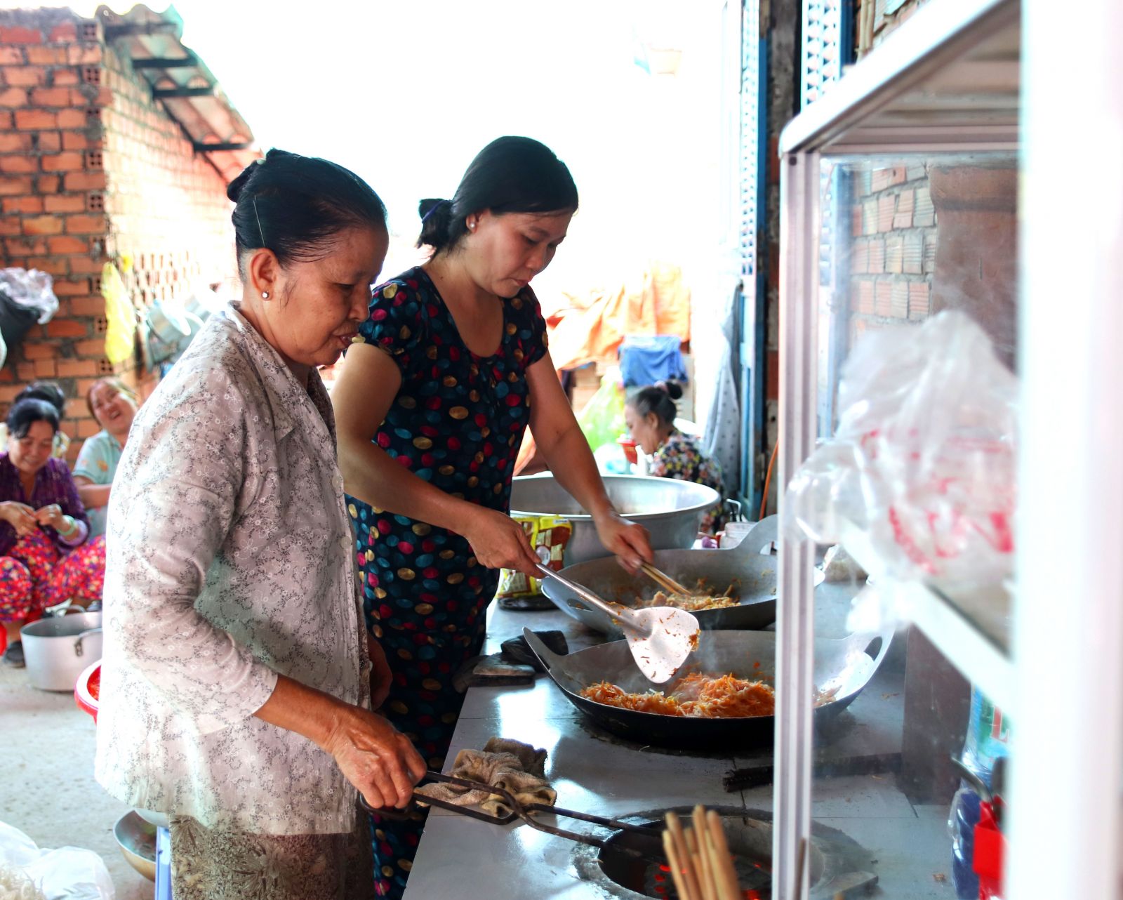 Hơn 16 giờ, không khí tại nhà bà Xinh rất nhộn nhịp, mỗi người một việc, người lặt rau, người vô nước tương, người xào nhân, mọi người cùng nhau trò chuyện rôm rả. Đang bận rộn làm nhân cho món bún chay ngày mai, bà Trần Thị Gạo (70 tuổi), ngụ ấp 1, xã Bình Tâm, tiếp chuyện: “Tôi có tuổi rồi nên không còn lao động kiếm tiền, mỗi ngày ở nhà nấu ăn cho các con. Từ ngày biết chị em trong ấp tổ chức hoạt động phát bữa sáng miễn phí, tôi thích lắm. Ngoài việc nội trợ, giờ đây, niềm vui của tôi là hàng tháng được quây quần cùng chị em chuẩn bị những suất ăn sáng miễn phí. Mình không phải đầu bếp chuyên nghiệp nên chủ yếu nêm nếm sao cho vừa ăn. Mặc dù là món chay nhưng phải bảo đảm dinh dưỡng và vệ sinh cho mọi người”.