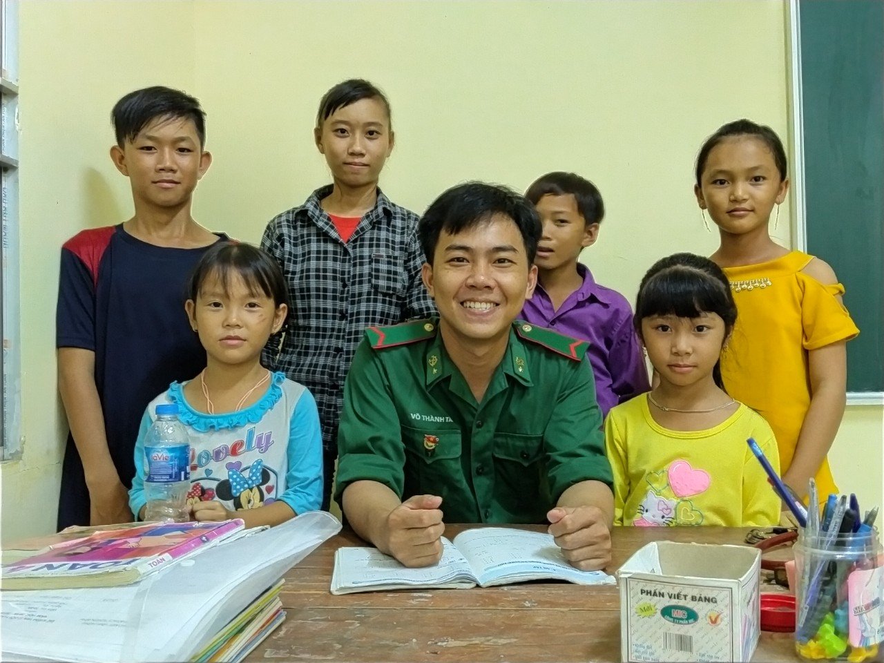 Những ngày đầu, nghe bọn trẻ gọi thầy, Tài còn “đỏ mặt” nhưng giờ mọi chuyện đã quen thuộc. Người dân ở vùng biên giới vẫn thường gọi Tài là thầy giáo quân hàm xanh. 18 giờ, vùng biên giới khá yên tĩnh. Đó cũng là thời điểm lớp học tình thương do ĐBP Tuyên Bình mở ra bắt đầu. Học sinh học tại lớp đa phần là con em của các hộ dân Việt kiều trở về từ Biển Hồ, Campuchia, có hoàn cảnh rất khó khăn, đa số không biết đọc, biết chữ tiếng Việt.
