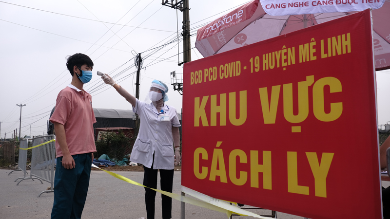| Nhân viên y tế tiến hành đo thân nhiệt của một người dân ở thôn Hạ Lôi (xã Mê Linh) Ảnh: Phạm Hùng |