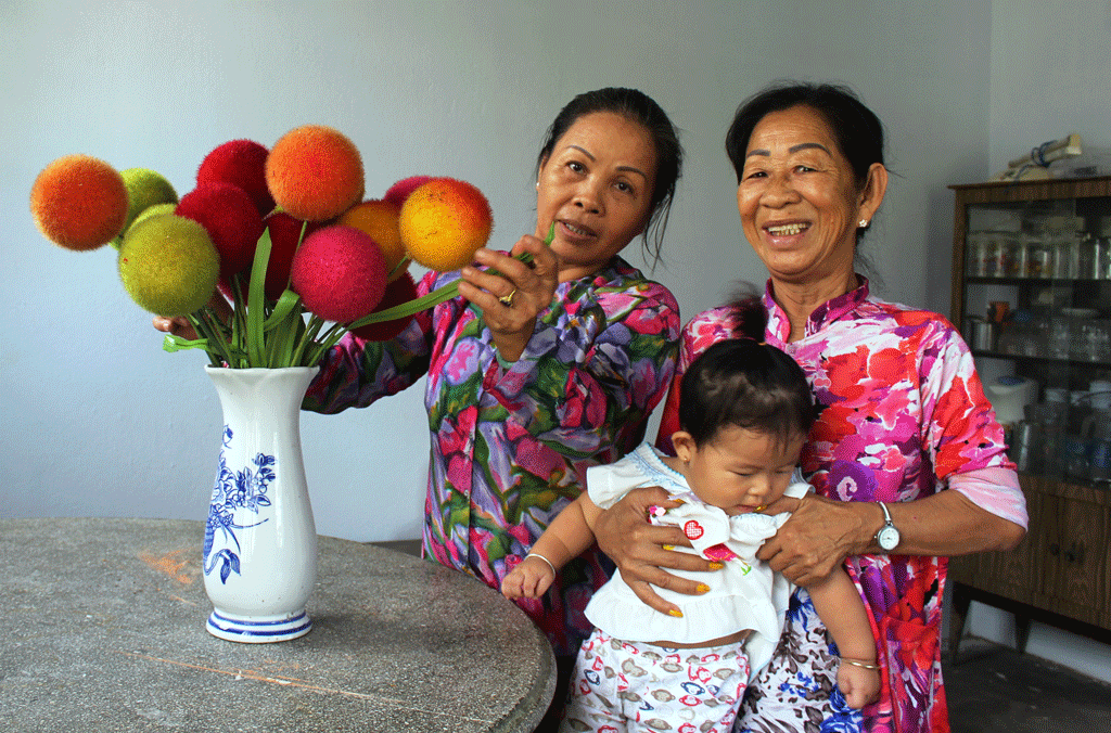 Bà Hồ Thị Mến (bên trái), được chủ nhà tặng hoa trang trí nhà nhân dịp xuân về, tết đến