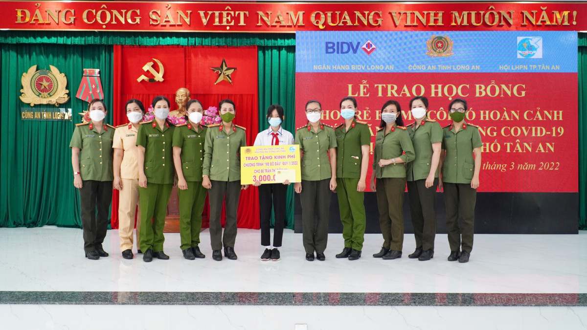 Công an tỉnh Long An phối hợp Ngân hàng Thương mại Cổ phần Đầu tư và phát triển Việt Nam, Chi nhánh Long An (BIDV) và Hội Liên hiệp Phụ ữ TP.Tân An tổ chức chương trình trao học bổng cho học sinh là trẻ em mồ côi, có hoàn cảnh khó khăn