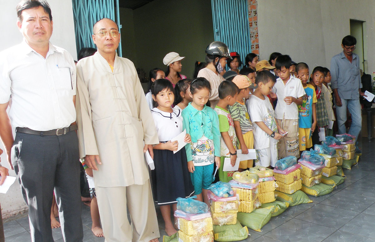 Hòa thượng Thích Huệ Tâm (thứ 2, trái qua) trao quà cho học sinh nghèo